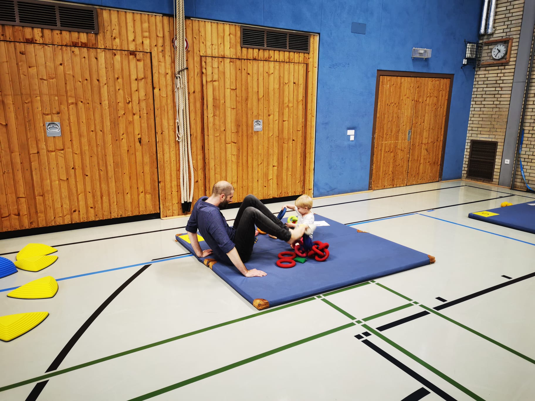 Nach der Begrüßung wurden zur Erwärmung Bewegungsspiele rund um das Thema „Spiele mit Chiffontüchern“ angeboten. Die Familien setzen die Aufgaben für sich, aber auch mit anderen Familien um.