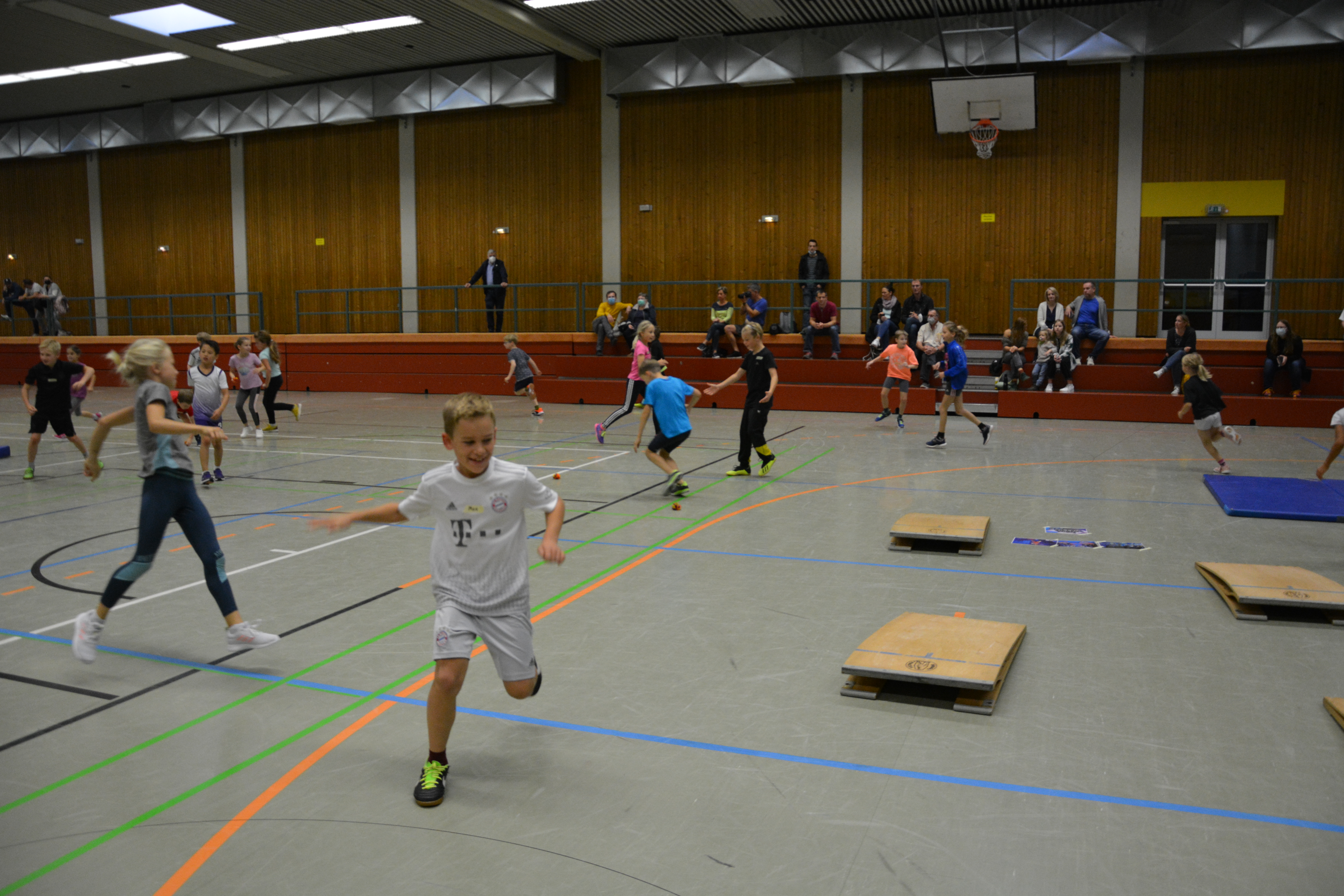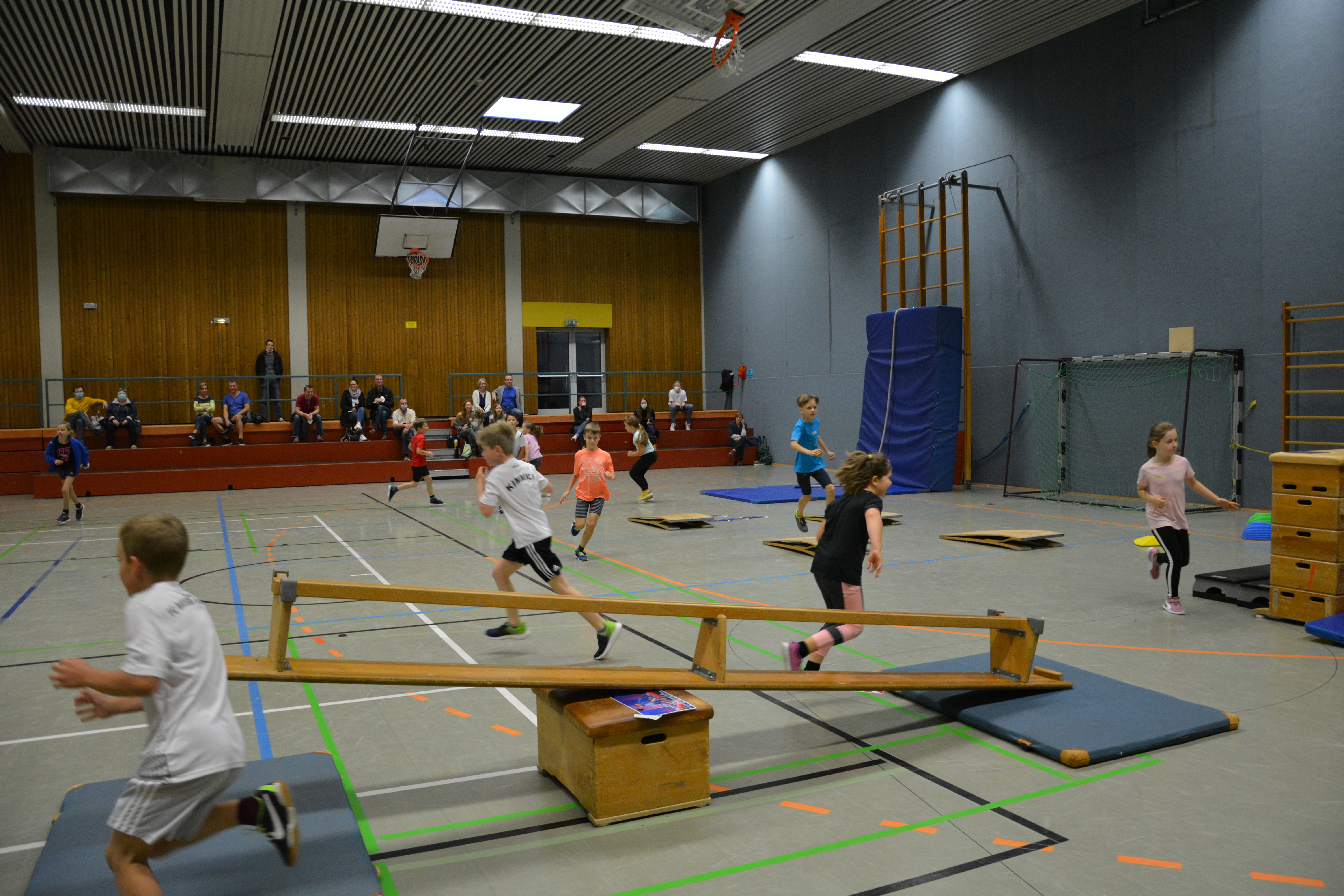 Ein Team der Kinderturnabteilung hat am 03.10.21 mit weiteren Helfern und Unterstützung der Eltern, in der Dreifachturnhalle insgesamt 14 herausfordernde Gerätekombinationen aufgebaut. Die Kinder konnten ihre Geschicklichkeit, Koordination und Schnelligkeit zeigen. „An den Lianen“ konnten sie von Tau zu Tau hangeln ohne in ein Wasserbecken zu fallen. In einem „Labyrinth“ mussten sie zwischen zwei liegenden Weichböden, einen Weg zur anderen Seite finden. Beim „ Sprung über den Berg“ sollten sie über ein Mini -Trampolin auf eine schiefe Ebene springen. Eine „große Schlucht“ musste durchquert werden. Eine „Wackelbrücke“ aus Röhren, die mit Seilchen an einem Barren befestigt waren, konnte überwunden werden. Und natürlich durfte die „Mega Wand“ nicht fehlen. Hier mussten die Kinder einen Buzzer drücken, der auf einem hochaufgestellten Weichboden platziert war. Dies und noch vieles mehr verlangte den Kindern und Jugendlichen ihr Können ab.
